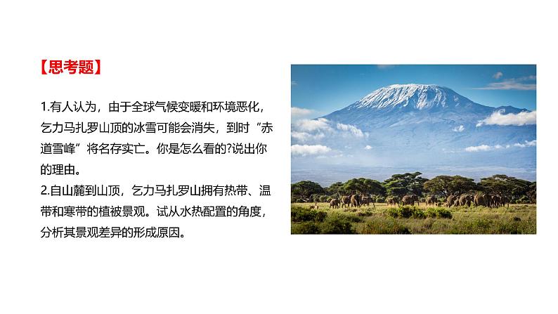 1.有人认为,由于全球气候变暖和环境恶化,乞力马扎罗山顶的冰雪可能会消失,到时“赤道雪峰”将名存实亡。你是怎么看的?说出你的理由。2.自山麓到山顶,乞力马扎罗山拥有热带、温带和寒带的植被景观。试从水热配置的角度,分析其景观差异的形成原因。