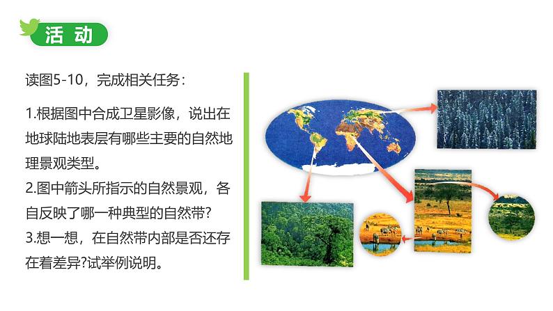 1.根据图中合成卫星影像,说出在地球陆地表层有哪些主要的自然地理景观类型。2.图中箭头所指示的自然景观,各自反映了哪一种典型的自然带?3.想一想,在自然带内部是否还存在着差异?试举例说明。