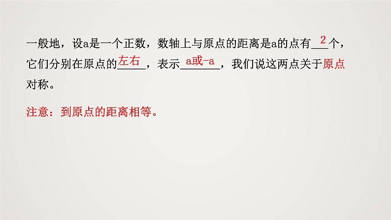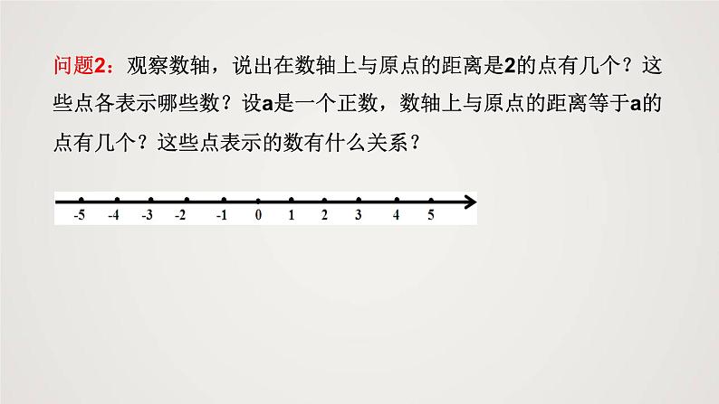 问题2:观察数轴,说出在数轴上与原点的距离是2的点有几个?这些点各表示哪些数?设a是一个正数,数轴上与原点的距离等于a的点有几个?这些点表示的数有什么关系?