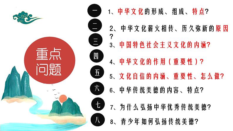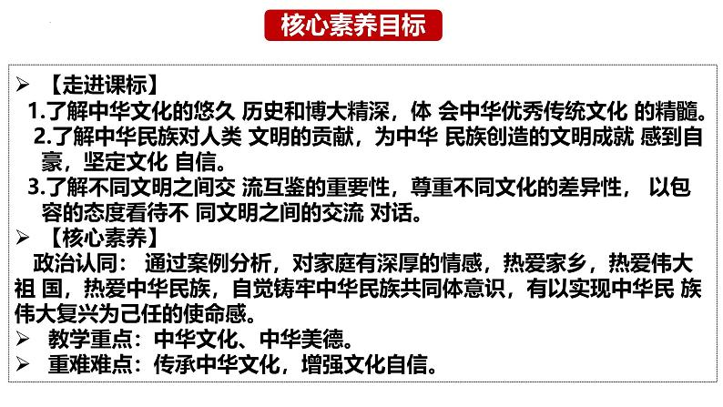 这是一份初中政治 (道德与法治)人教版(2024)九年级上册延续文化血脉背景图ppt课件,共33页。PPT课件主要包含了学习重点,中华文化根,博大精深,源远流长,美德万年长等内容,欢迎下载使用。