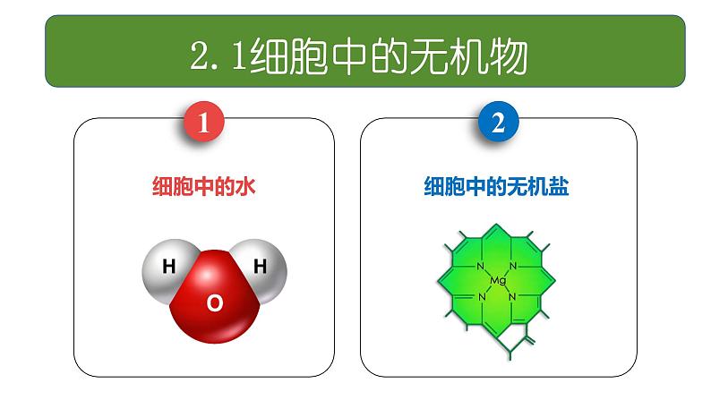 高中人教版 (2019)第2节 细胞中的无机物获奖课件ppt: 这是一份高中人教版 (2019)<a href="/sw/tb_c162336_t3/?tag_id=26" target="_blank">第2节 细胞中的无机物获奖课件ppt</a>,共30页。PPT课件主要包含了口渴了你喝什么,第一部分,细胞中的水,第二部分,细胞中的无机盐,第三部分,课堂总结等内容,欢迎下载使用。