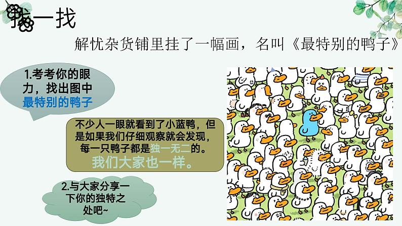 不少人一眼就看到了小蓝鸭,但是如果我们仔细观察就会发现,每一只鸭子都是独一无二的。我们大家也一样。