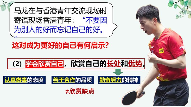 这是一份初中政治 (道德与法治)人教版(2024)七年级上册(2024)做更好的自己备课课件ppt,共22页。PPT课件主要包含了🐾找一找,我们要学会欣赏自己,方法与技能,改正缺点的方法,课堂练习等内容,欢迎下载使用。