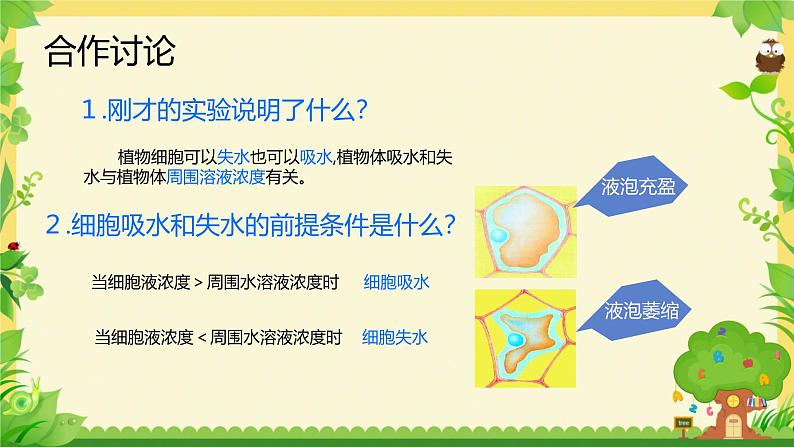 2.细胞液浓度大于周围溶液浓度细胞吸水,反之。