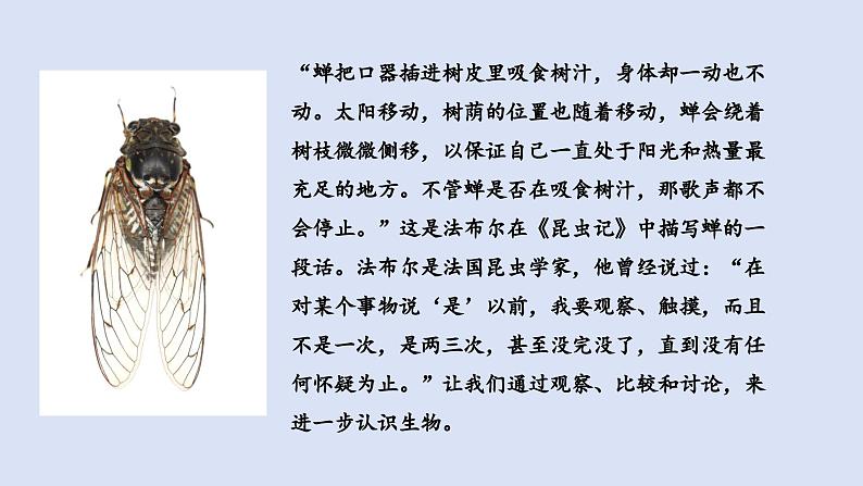 “蝉把口器插进树皮里吸食树汁,身体却一动也不动。太阳移动,树荫的位置也随着移动,蝉会绕着树枝微微侧移,以保证自己一直处于阳光和热量最充足的地方。不管蝉是否在吸食树汁,那歌声都不会停止。”这是法布尔在《昆虫记》中描写蝉的一段话。法布尔是法国昆虫学家,他曾经说过:“在对某个事物说‘是’以前,我要观察、触摸,而且不是一次,是两三次,甚至没完没了,直到没有任何怀疑为止。”让我们通过观察、比较和讨论,来进一步认识生物。