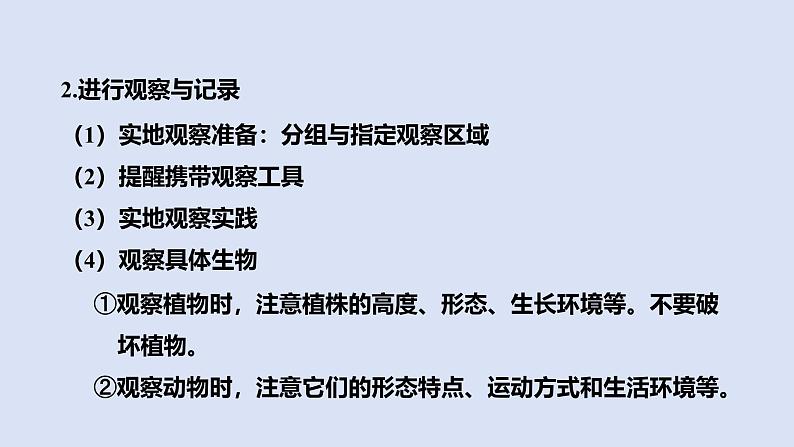 (1)实地观察准备:分组与指定观察区域(2)提醒携带观察工具(3)实地观察实践(4)观察具体生物
