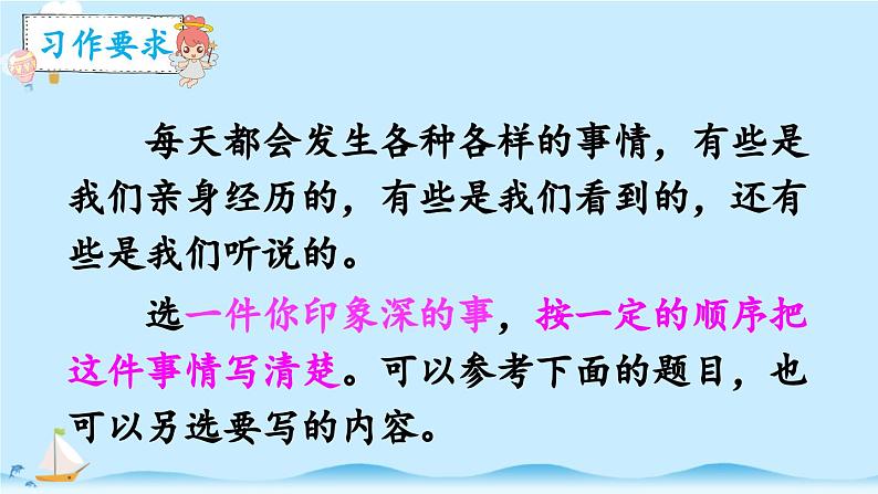 每天都会发生各种各样的事情,有些是我们亲身经历的,有些是我们看到的,还有些是我们听说的。 选一件你印象深的事,按一定的顺序把这件事情写清楚。可以参考下面的题目,也可以另选要写的内容。