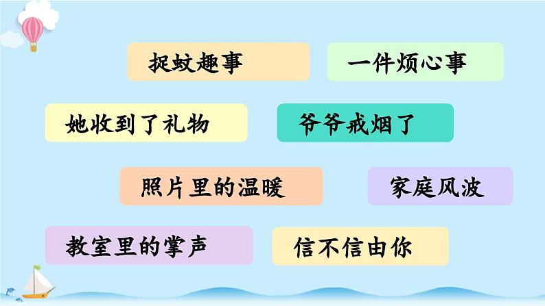 这是一份小学语文统编版(2024)四年级上册习作:生活万花筒教学课件ppt,共14页。PPT课件主要包含了捉蚊趣事,一件烦心事,家庭风波,照片里的温暖,她收到了礼物,信不信由你,教室里的掌声,爷爷戒烟了,避暑记等内容,欢迎下载使用。