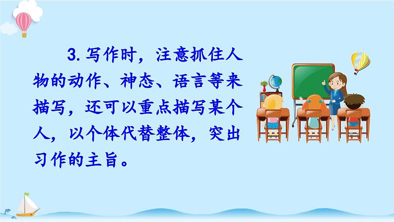 3.写作时,注意抓住人物的动作、神态、语言等来描写,还可以重点描写某个人,以个体代替整体,突出习作的主旨。