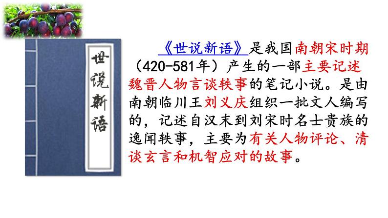 《世说新语》是我国南朝宋时期(420-581年)产生的一部主要记述魏晋人物言谈轶事的笔记小说。是由南朝临川王刘义庆组织一批文人编写的,记述自汉末到刘宋时名士贵族的逸闻轶事,主要为有关人物评论、清谈玄言和机智应对的故事。