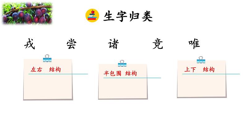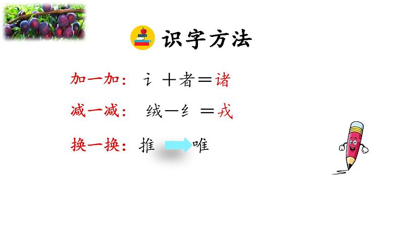 这是一份小学语文统编版(2024)四年级上册王戎不取道旁李备课课件ppt,共14页。PPT课件主要包含了加一加,讠+者=诸,绒-纟=戎,换一换,减一减,识字游戏,摘李子,整体感知,辨字组词,惟妙惟肖等内容,欢迎下载使用。