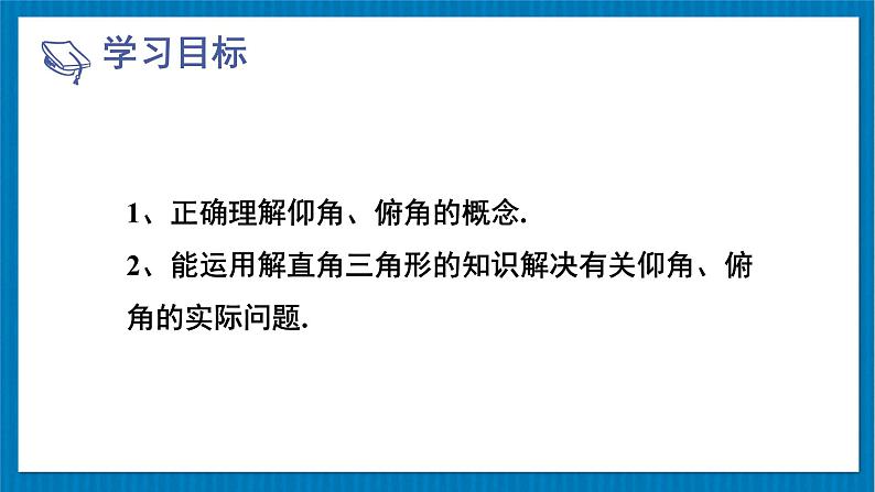 1、正确理解仰角、俯角的概念.2、能运用解直角三角形的知识解决有关仰角、俯角的实际问题.