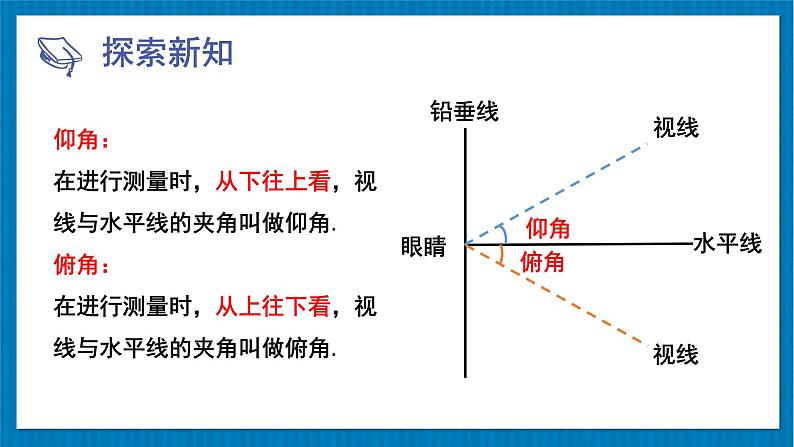 仰角:在进行测量时,从下往上看,视线与水平线的夹角叫做仰角.俯角:在进行测量时,从上往下看,视线与水平线的夹角叫做俯角.