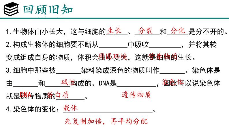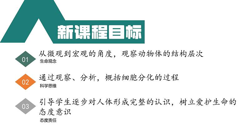 这是一份人教版(2024)七年级上册(2024)第二节 动物体的结构层次教学课件ppt,共37页。PPT课件主要包含了知识回顾,染色体,新课导入,学习目标,细胞分化,人体的四种基本组织,组织进一步形成器官,胃的组织构成与功能,器官构成系统和人体,课堂小结等内容,欢迎下载使用。