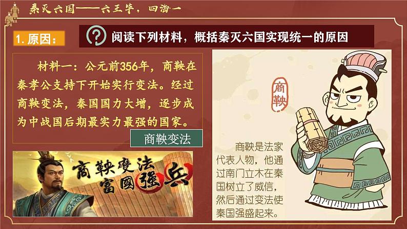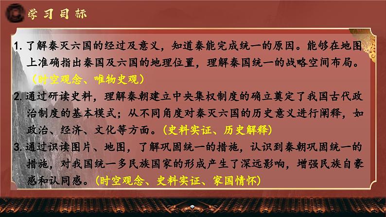 1.了解秦灭六国的经过及意义,知道秦能完成统一的原因。能够在地图上准确指出秦国及六国的地理位置,理解秦国统一的战略空间布局。(时空观念、唯物史观)2.通过研读史料,理解秦朝建立中央集权制度的确立奠定了我国古代政治制度的基本模式;从不同角度对秦灭六国的历史意义进行阐释,如政治、经济、文化等方面。(史料实证、历史解释)3.通过识读图片、地图,了解巩固统一的措施,认识到秦朝巩固统一的措施,对我国统一多民族国家的形成产生了深远影响,增强民族自豪感和认同感。(时空观念、史料实证、家国情怀)