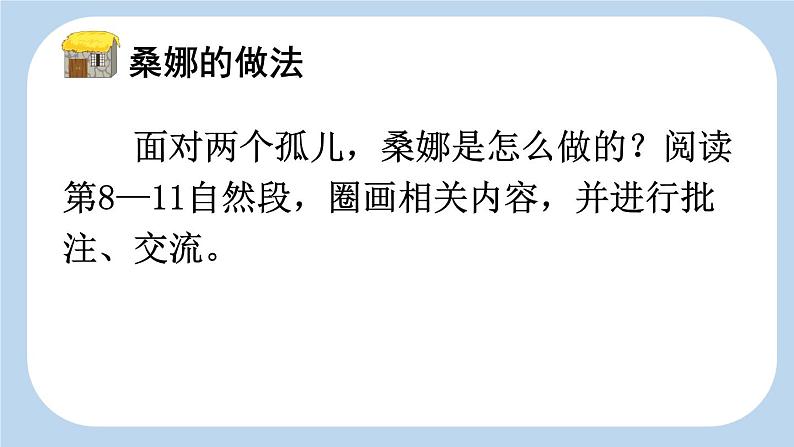 面对两个孤儿,桑娜是怎么做的?阅读第8—11自然段,圈画相关内容,并进行批注、交流。