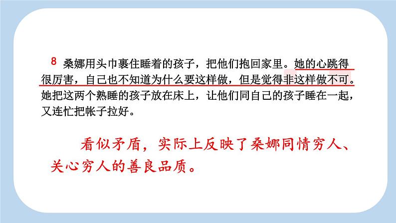 看似矛盾,实际上反映了桑娜同情穷人、关心穷人的善良品质。