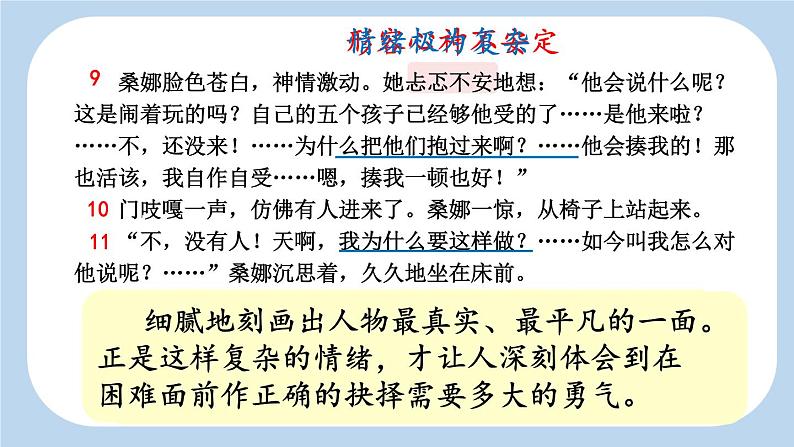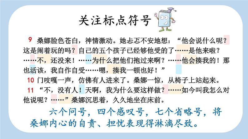 六个问号,四个感叹号,七个省略号,将桑娜内心的自责、担忧表现得淋漓尽致。