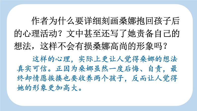 这样的心理,实际上更让人觉得桑娜的想法真实可信。正因为桑娜虽然一度后悔、自责,最终却情愿挨揍也要收养两个孩子,反而让人觉得她的形象更加高大。