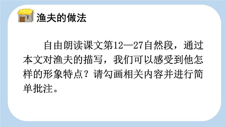 自由朗读课文第12—27自然段,通过本文对渔夫的描写,我们可以感受到他怎样的形象特点?请勾画相关内容并进行简单批注。
