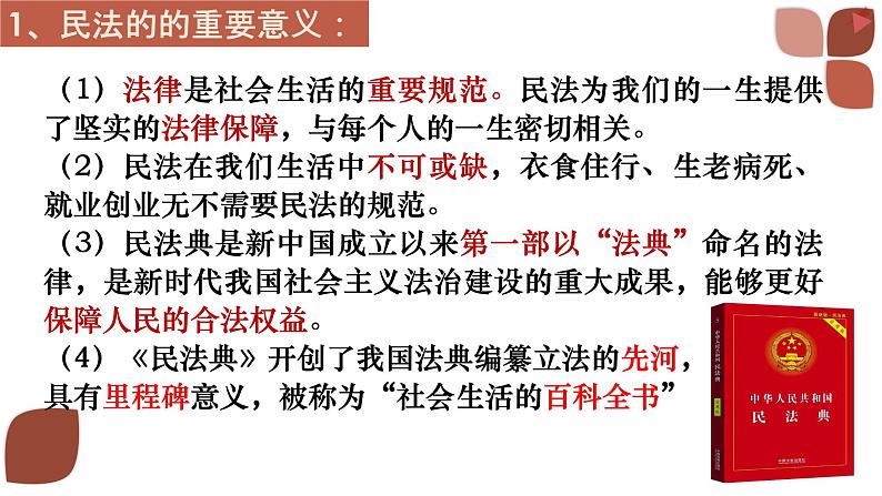 (1)法律是社会生活的重要规范。民法为我们的一生提供了坚实的法律保障,与每个人的一生密切相关。(2)民法在我们生活中不可或缺,衣食住行、生老病死、就业创业无不需要民法的规范。(3)民法典是新中国成立以来第一部以“法典”命名的法律,是新时代我国社会主义法治建设的重大成果,能够更好保障人民的合法权益。(4)《民法典》开创了我国法典编纂立法的先河,具有里程碑意义,被称为“社会生活的百科全书”