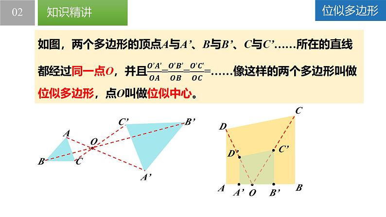 【总结】若两个多边形位似,则这两个多边形对应边互相平行(或在同一条直线上)。