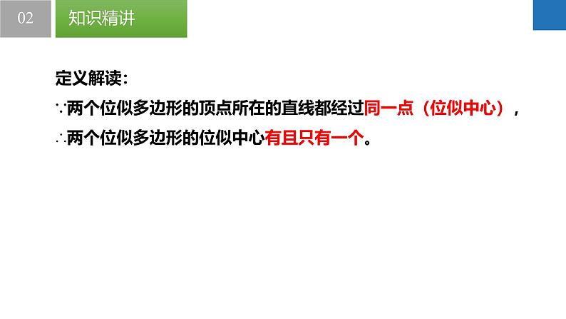 定义解读:∵两个位似多边形的顶点所在的直线都经过同一点(位似中心),∴两个位似多边形的位似中心有且只有一个。
