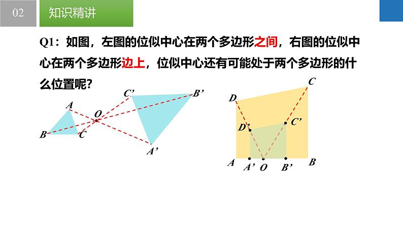 Q1:如图,左图的位似中心在两个多边形之间,右图的位似中心在两个多边形边上,位似中心还有可能处于两个多边形的什么位置呢?