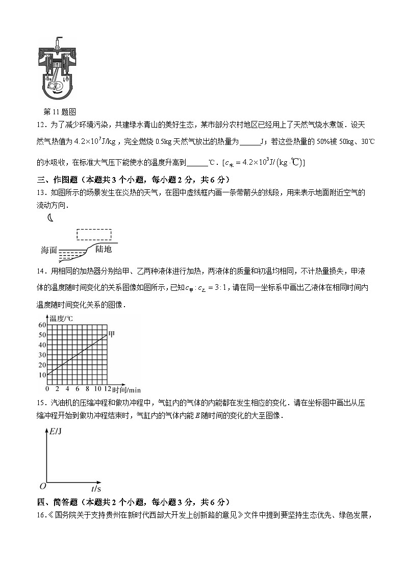 14.用相同的加热器分别给甲、乙两种液体进行加热,两液体的质量和初温均相同,不计热量损失,甲液体的温度随时间变化的关系图像如图所示,已知,请在同一坐标系中画出乙液体在相同时间内温度随时间变化关系的图像.
