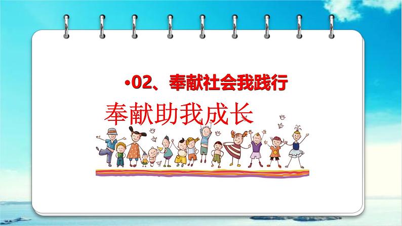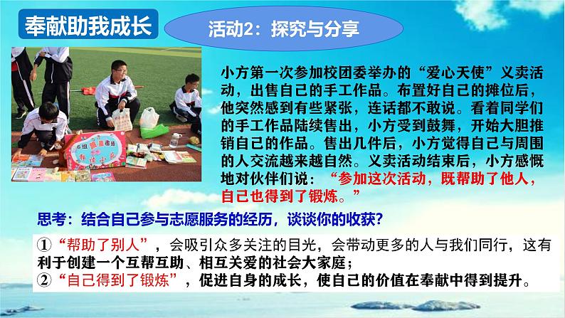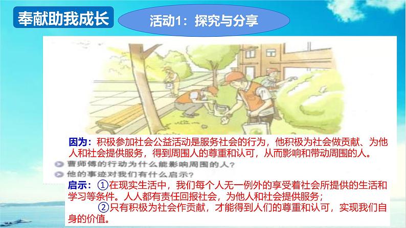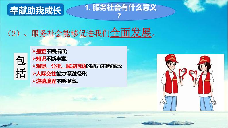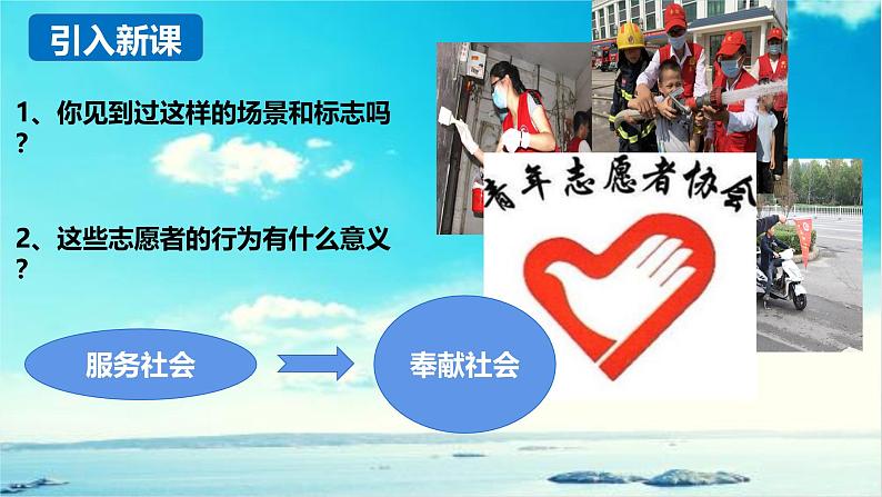 这是一份人教版(2024)八年级上册服务社会授课ppt课件,共19页。PPT课件主要包含了奉献助我成长,做好准备,课堂练习等内容,欢迎下载使用。