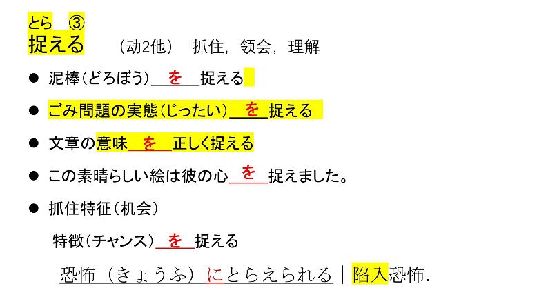 とら③捉える(动2他)抓住,领会,理解泥棒(どろぼう) 捉える ごみ問題の実態(じったい) 捉える 文章の意味 正しく捉える この素晴らしい絵は彼の心 捉えました。 抓住特征(机会) 特徴(チャンス) 捉える 恐怖(きょうふ)にとらえられる|陷入恐怖.