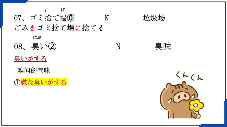 にお08、臭い② N 臭味臭いがする 难闻的气味