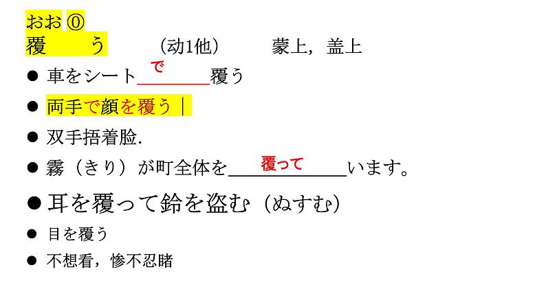 おお⓪覆 う(动1他)蒙上,盖上車をシート 覆う 両手で顔を覆う|双手捂着脸.霧(きり)が町全体を います。 耳を覆って鈴を盗む(ぬすむ) 目を覆う不想看,惨不忍睹