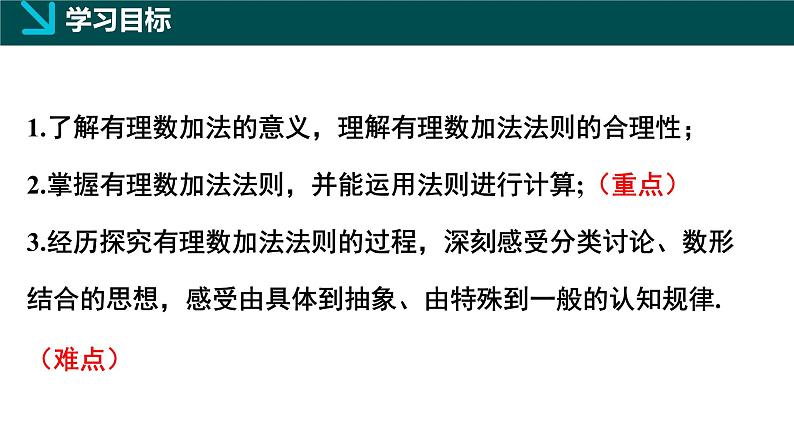 1.了解有理数加法的意义,理解有理数加法法则的合理性;2.掌握有理数加法法则,并能运用法则进行计算;(重点)3.经历探究有理数加法法则的过程,深刻感受分类讨论、数形结合的思想,感受由具体到抽象、由特殊到一般的认知规律.(难点)
