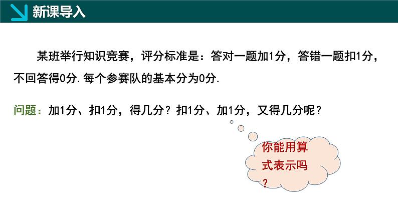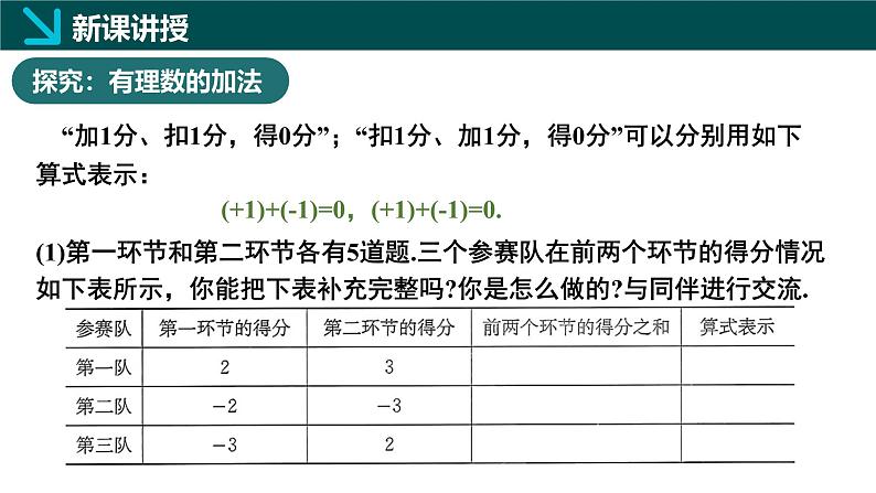 “加1分、扣1分,得0分”;“扣1分、加1分,得0分”可以分别用如下算式表示: (+1)+(-1)=0,(+1)+(-1)=0.