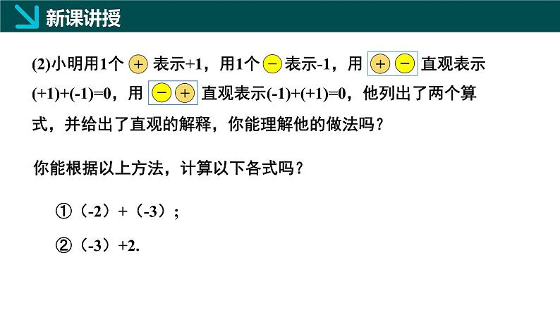 (2)异号两数相加,绝对值相等时和为0;绝对值不等时,取绝对值较大的数的符号,并用较大的绝对值减去较小的绝对值.