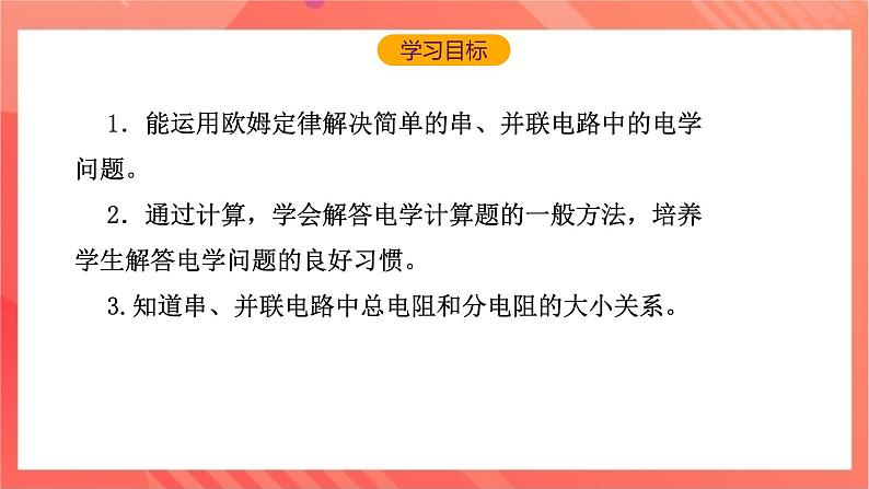 1.能运用欧姆定律解决简单的串、并联电路中的电学问题。2.通过计算,学会解答电学计算题的一般方法,培养学生解答电学问题的良好习惯。3.知道串、并联电路中总电阻和分电阻的大小关系。