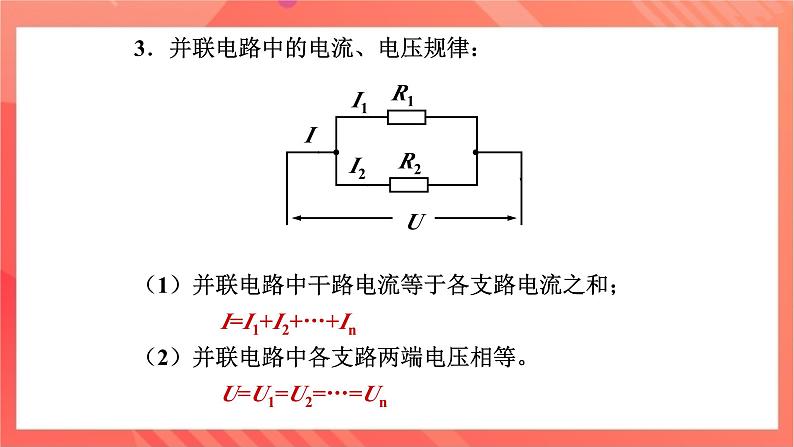 (1)并联电路中干路电流等于各支路电流之和; I=I1+I2+…+In(2)并联电路中各支路两端电压相等。 U=U1=U2=…=Un
