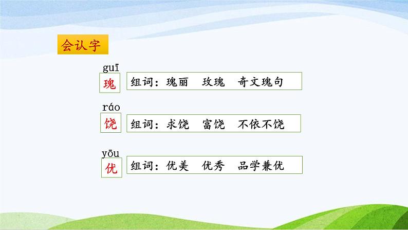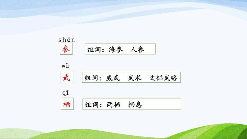这是一份小学语文统编版(2024)三年级上册富饶的西沙群岛授课ppt课件,共32页。PPT课件主要包含了第一课时,新课导入,资料宝袋,yōu优,字词乐园,会写字,易错提示,会认字,组词海参人参,组词两栖栖息等内容,欢迎下载使用。
