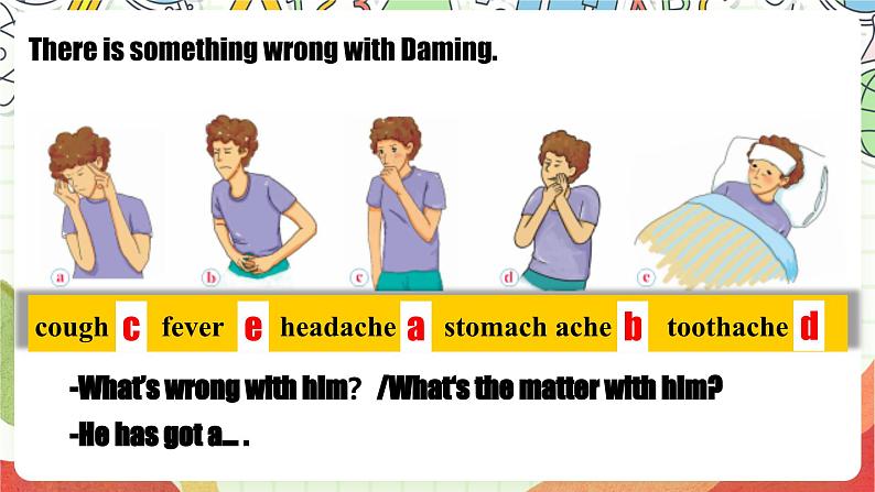 -What’s wrng with him?/What‘s the matter with him?-He has gt a... .
