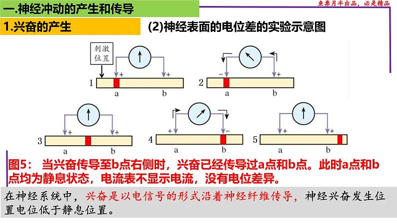 图5: 当兴奋传导至b点右侧时,兴奋已经传导过a点和b点。此时a点和b点均为静息状态,电流表不显示电流,没有电位差异。