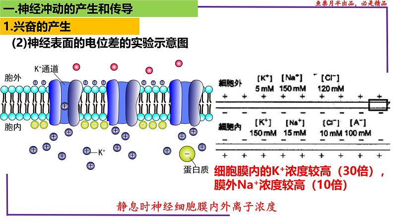 细胞膜内的K+浓度较高(30倍),膜外Na+浓度较高(10倍)