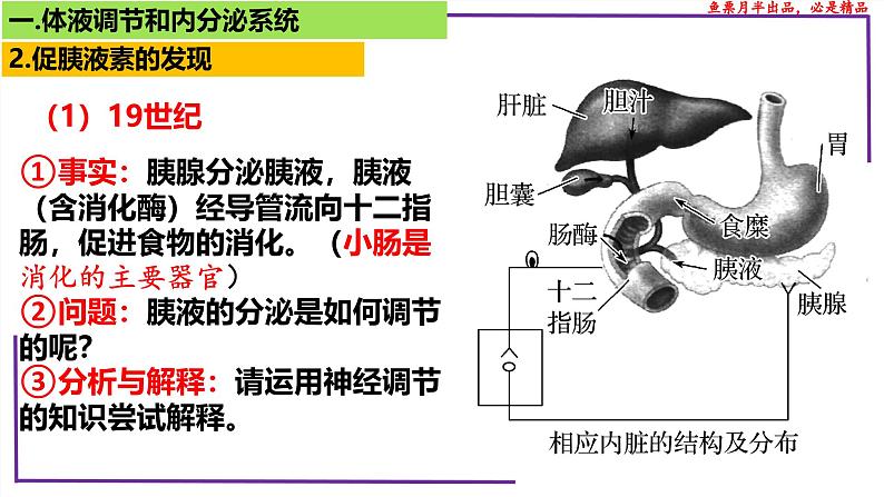 ①事实:胰腺分泌胰液,胰液(含消化酶)经导管流向十二指肠,促进食物的消化。(小肠是消化的主要器官)②问题:胰液的分泌是如何调节的呢?③分析与解释:请运用神经调节的知识尝试解释。