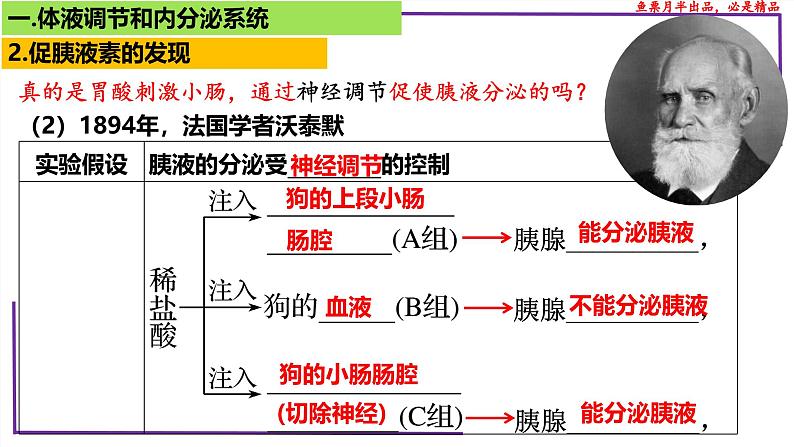 ④结论:19世纪的学术界普遍认为:胃酸刺激小肠的神经,胰液的分泌是神经调节