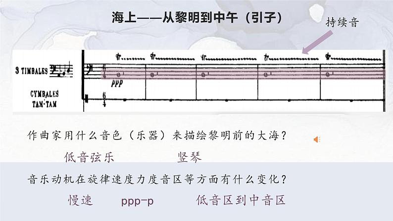 作曲家用什么音色(乐器)来描绘黎明前的大海?音乐动机在旋律速度力度音区等方面有什么变化?