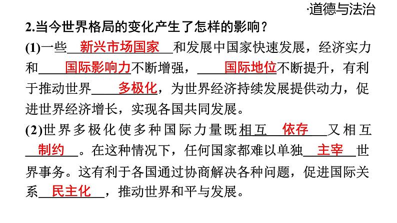 2.当今世界格局的变化产生了怎样的影响?(1)一些 和发展中国家快速发展,经济实力和 不断增强, 不断提升,有利于推动世界 ,为世界经济持续发展提供动力,促进世界经济增长,实现各国共同发展。 (2)世界多极化使多种国际力量既相互 又相互 。在这种情况下,任何国家都难以单独 世界事务。这有利于各国通过协商解决各种问题,促进国际关系 ,推动世界和平与发展。