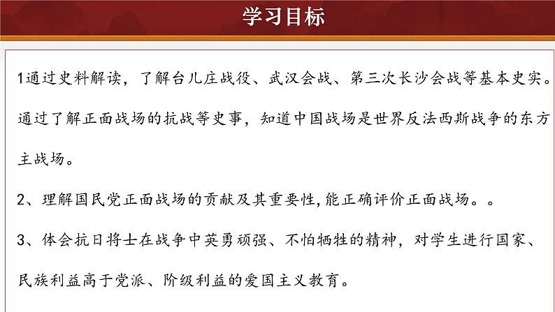 这是一份初中历史人教版(2024)八年级上册第20课 正面战场的抗战优秀课件ppt,共16页。PPT课件主要包含了学习目标,年610月,江西万家岭战役,年12月等内容,欢迎下载使用。