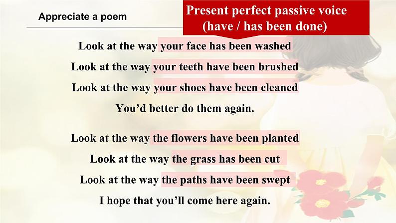 Lk at the way yur face has been washedLk at the way yur teeth have been brushedLk at the way yur shes have been cleaned Yu’d better d them again. Lk at the way the flwers have been plantedLk at the way the grass has been cutLk at the way the paths have been sweptI hpe that yu’ll cme here again.