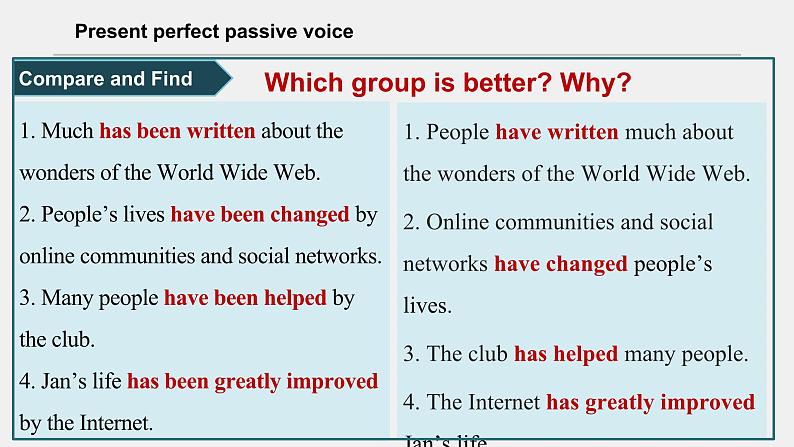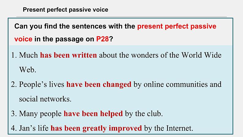 1. Much has been written abut the wnders f the Wrld Wide Web.2. Peple’s lives have been changed by nline cmmunities and scial netwrks. 3. Many peple have been helped by the club. 4. Jan’s life has been greatly imprved by the Internet.