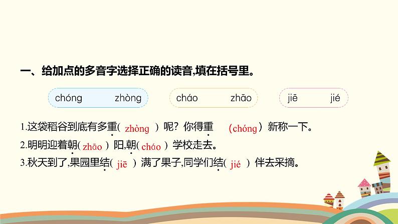 1.这袋稻谷到底有多重( ) 呢?你得重 )新称一下。2.明明迎着朝( ) 阳,朝( ) 学校走去。3.秋天到了,果园里结( ) 满了果子,同学们结( ) 伴去采摘。